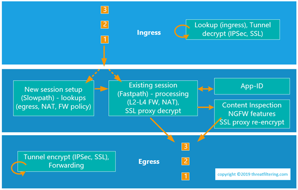 Order of operations in Palo Alto Networks firewalls consists of 6 stages: Ingress > Session Setup (Slowpath) > Existing Session (Fastpath) > Application Identification > Content Inspection > Egress Forwarding. Understanding how traffic is being processed within the firewall is important for writing security and NAT policies and troubleshooting. The following sections provide information about each of the stages.