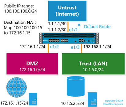 Consider the example in the following diagram. In this example, the firewall has 3 interfaces each allocated to a zone. There are no routes configured, apart from the default route with the next hop of 1.1.1.1. Service provider has allocated a public IP address range of 100.100.100.0/24.
