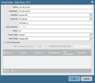 set network virtual-router default routing-table ip static-route 172.16.2.0-24 interface tunnel.100