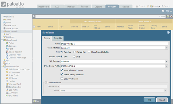 . Type-in tunnel name, select tunnel interface, IKE Gateway and IPSec Crypto Profile created in earlier steps.