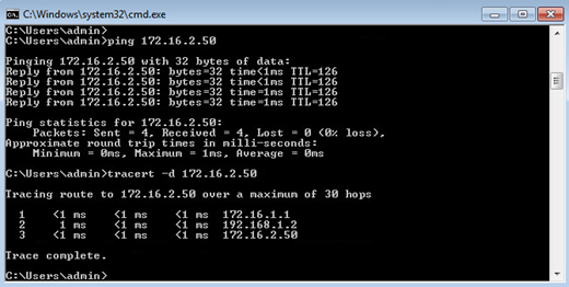 The next step of the testing will be sending traffic over tunnel from test Windows machines. The commands in the screenshot below are launched from a Windows 7 workstation with IP address of 172.16.1.5 (on the left side of the lab diagram).