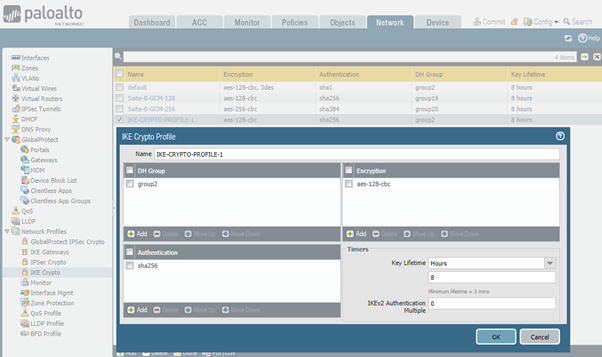 Navigate to the following menu: Network > Network Profiles > IKE Crypto > Add