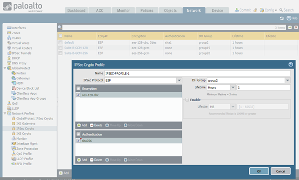 set network ike crypto-profiles ipsec-crypto-profiles IPSEC-PROFILE-1 esp encryption aes-128-cbc