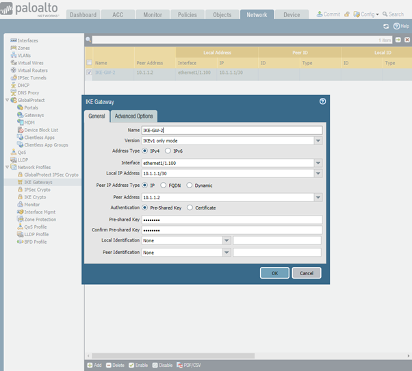 . Enter gateway name, IP address and pre-shared key. On Advanced Options tab select IKE Crypto Profile created earlier.