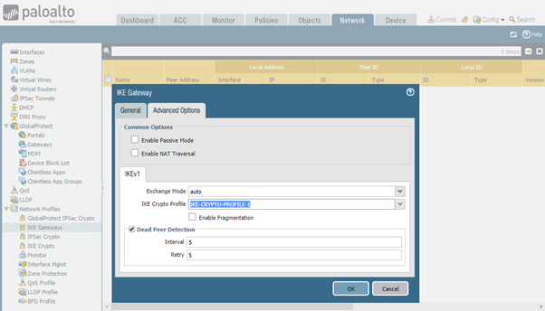 Navigate to the following menu: Network > Network Profiles > IKE Gateways > Add