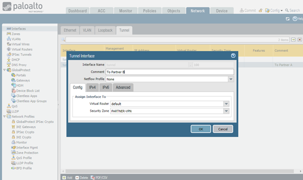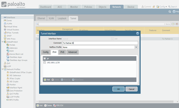 Navigate to the following menu: Interfaces. Click on Tunnel tab and press Add. Type-in tunnel interface number, “default” as virtual router and security zone created in the previous step. Configure IP address on IPv4 tab.