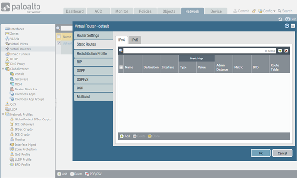 To configure static route, navigate to Network > Virtual Routers